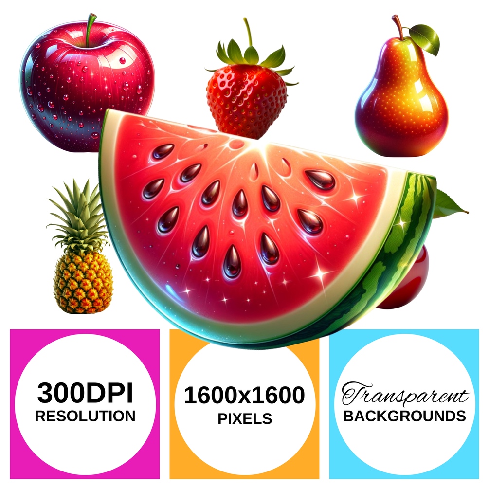 This listing includes 16 “Fresh Fruit” PNG Clipart images.