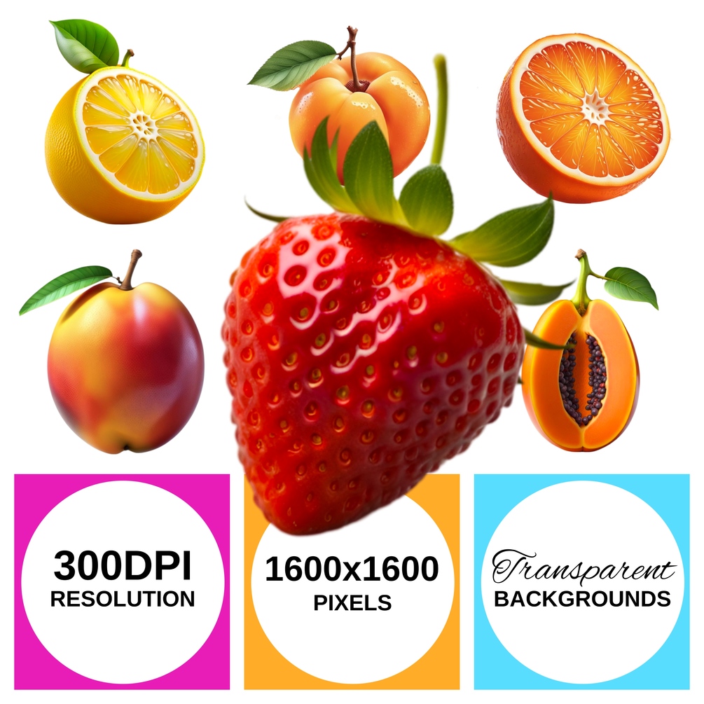This listing includes 16 “Fresh Fruit” PNG Clipart images.